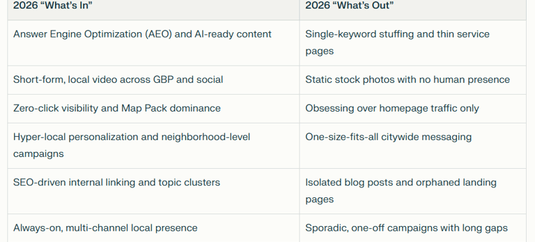 Local marketing that works in 2026 is built around visibility in AI-driven search, video-first storytelling, and hyper-local trust signals — all powered by a strong SEO foundation. Small businesses that adapt to answer engines, zero-click SERPs, and community-level personalization will outpace competitors still playing by 2019 rules.